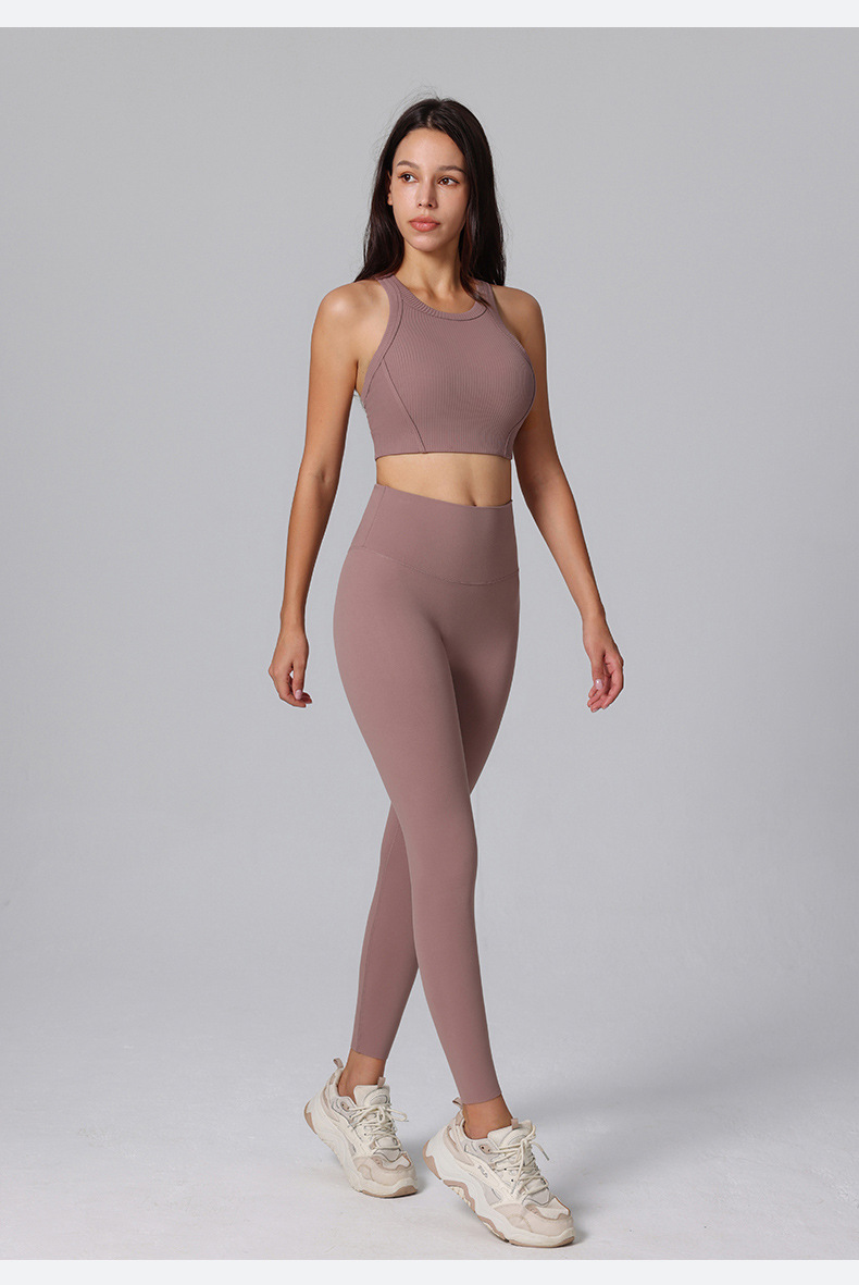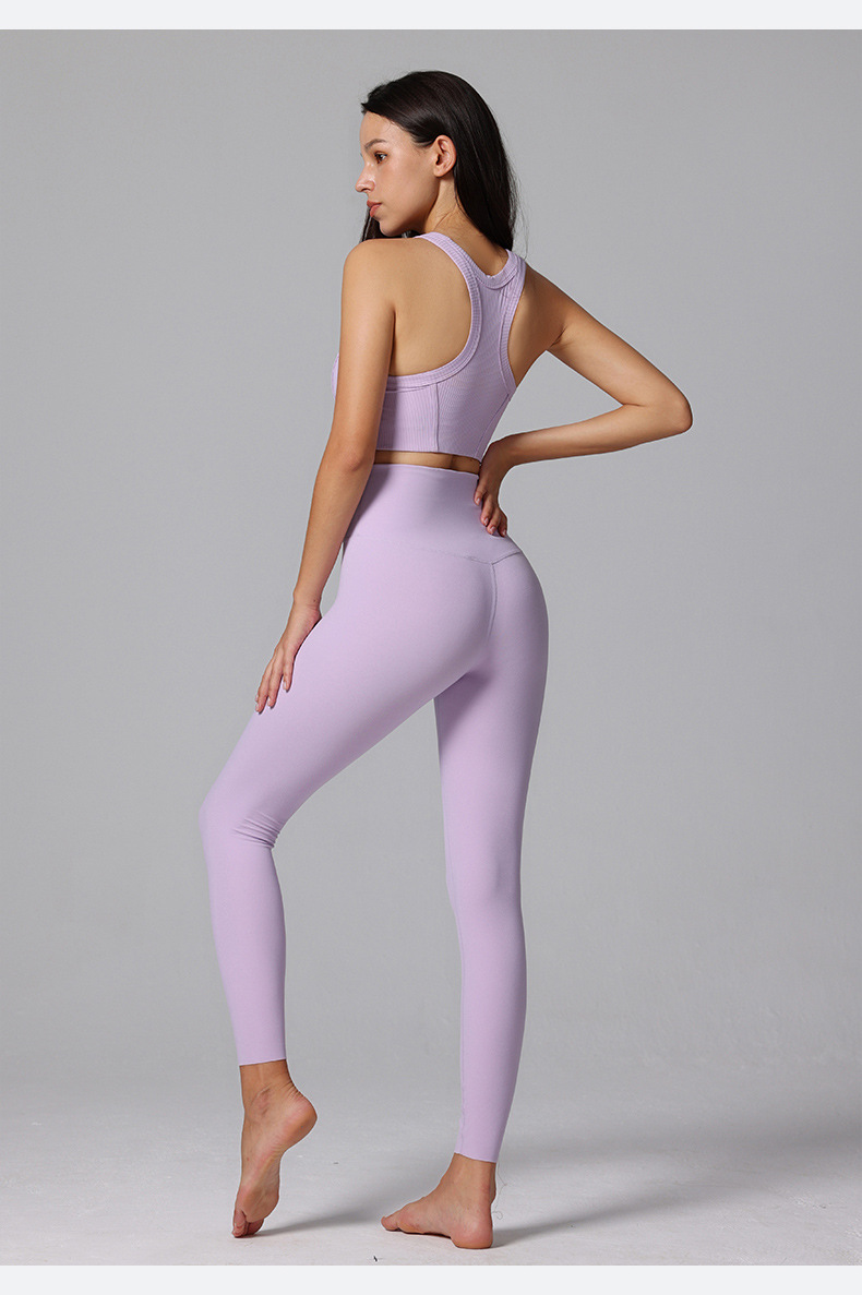 This high-waisted custom legging features a unique T-line butt lift with tommy control construction, pair with a simple design top with removable cup and race back. All can be customized in different colors.