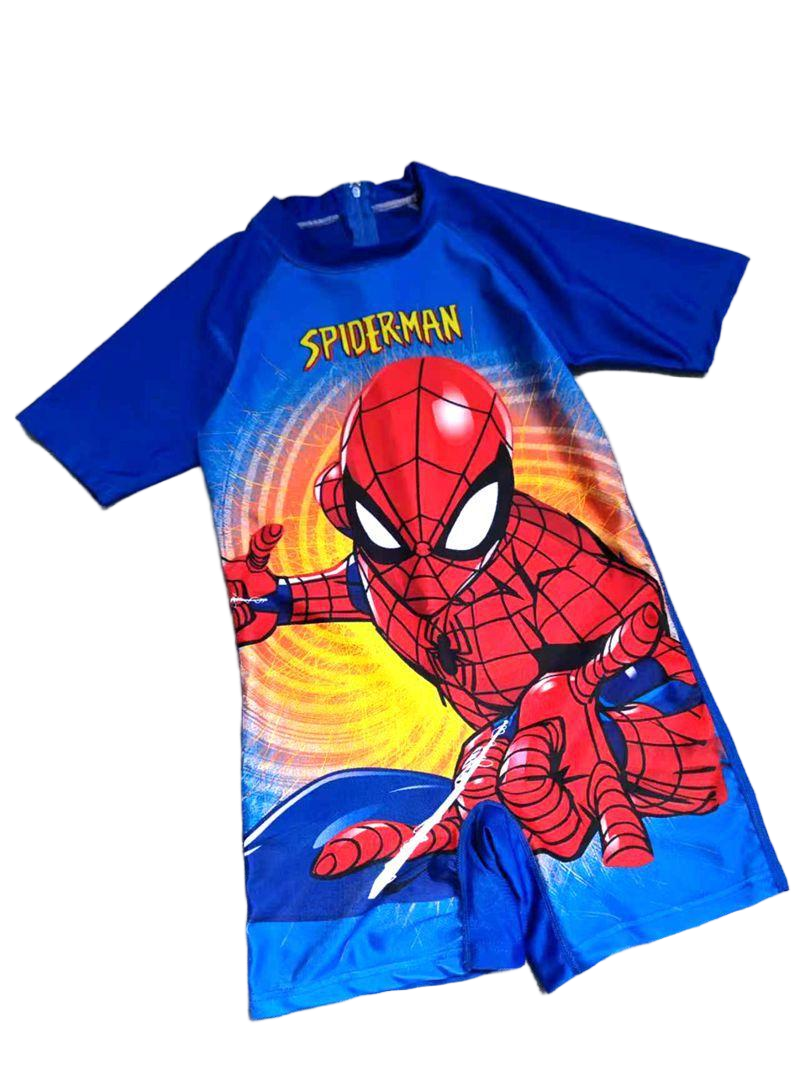 This boys’ UPF50+ sun protective custom print rashguard features a cute spiderman print, incorporating solid blue patches on the raglan sleeves, neckline, back panels, adding a clever contrast to the overall design.