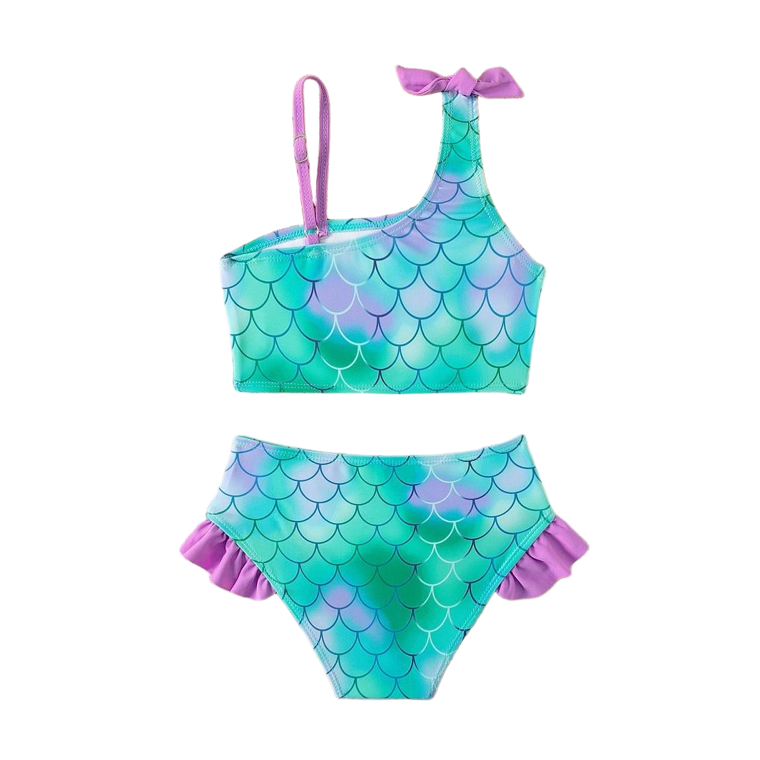 This eye-catching custom bikini set features a stunning shimmery foil print and ruffled details, offering a dazzling and playful beach look all-day wear.