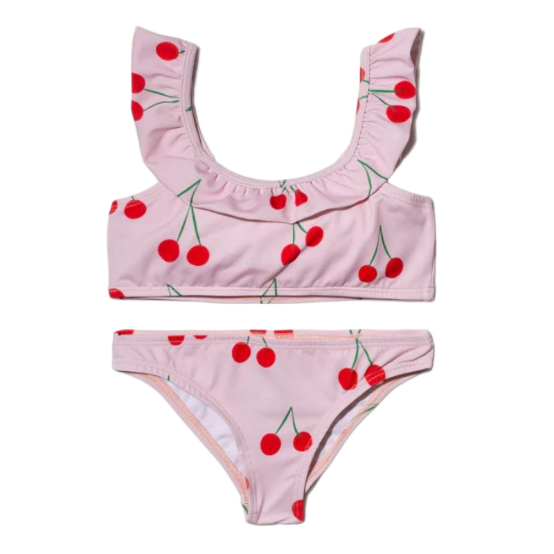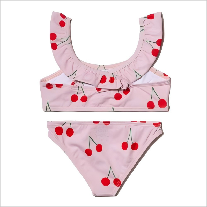 This adorable kids’ custom one-piece swimsuit features an all-over lemon print  self-fabric ruffles and a large back cutout with a charming bow detail, perfect for a stylish kids’ summer look, paired with the same style of bikini.